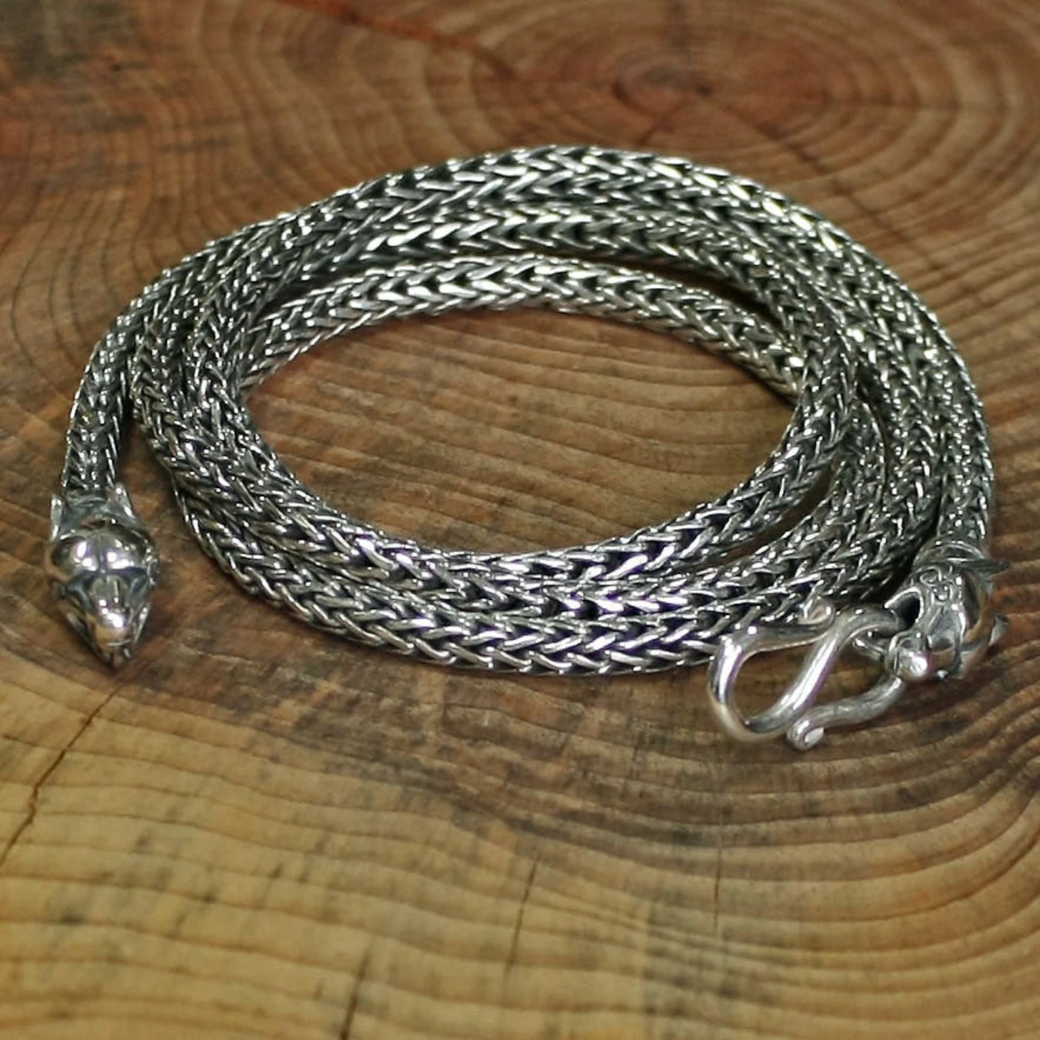 – Cast 925 sterling silver wolf heads with handmade sterling silver snake chain.
