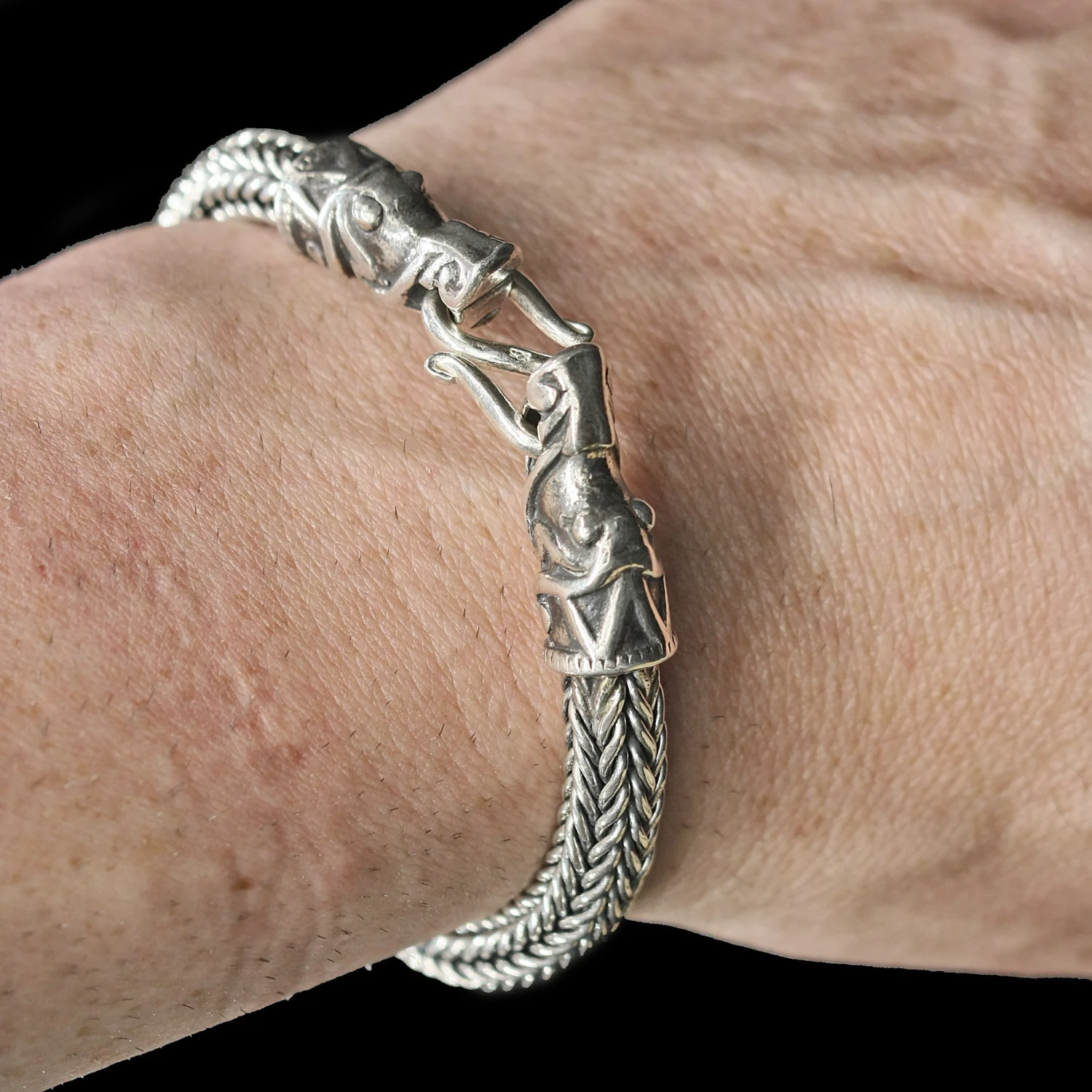 Sterling Silver Snake Chain Viking Bracelet with Gotlandic Dragon Head Terminals & S-Hook Clasp.