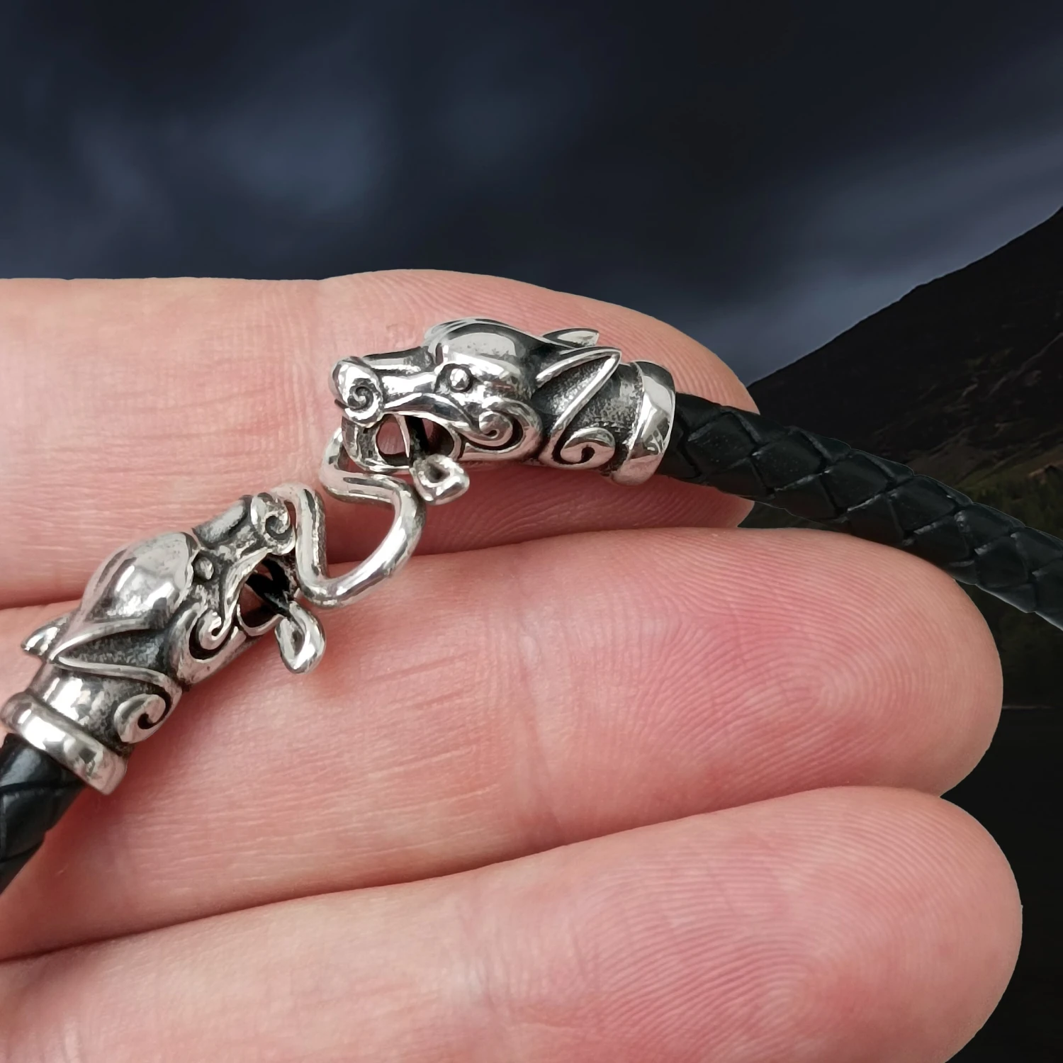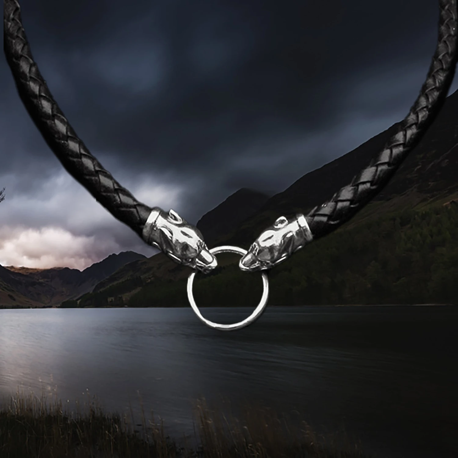 – Cast sterling silver wolf heads bonded to a braided leather rope.