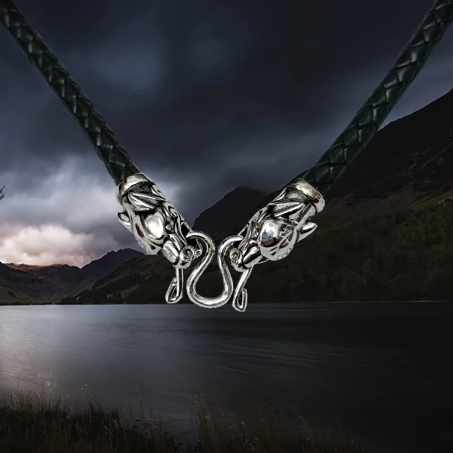 Our leather necklaces are made from braided leather cords with either Gotlandic dragon, Icelandic wolf, or ferocious wolf head terminals. They come in either 5mm or 8mm widths in a choice of lengths.