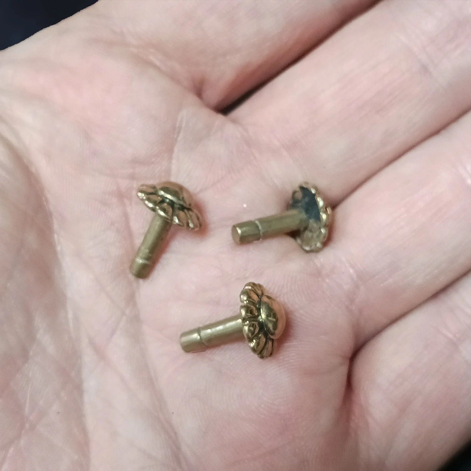 Each belt stud consists of a flower mount and a sprig for attachment, all cast together in one piece.
