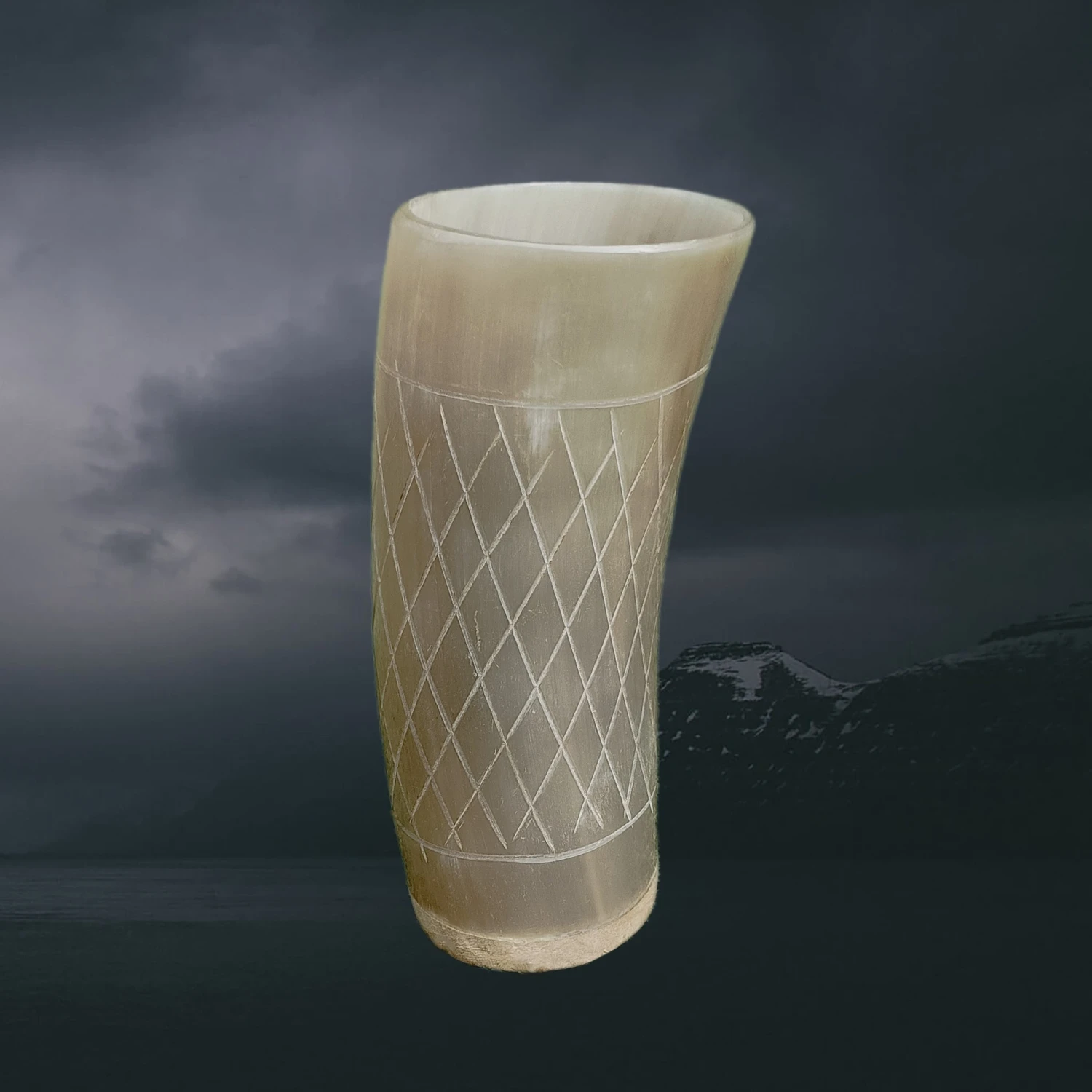 Polished Horn Beer Beaker with Wood Base and Carved Design
