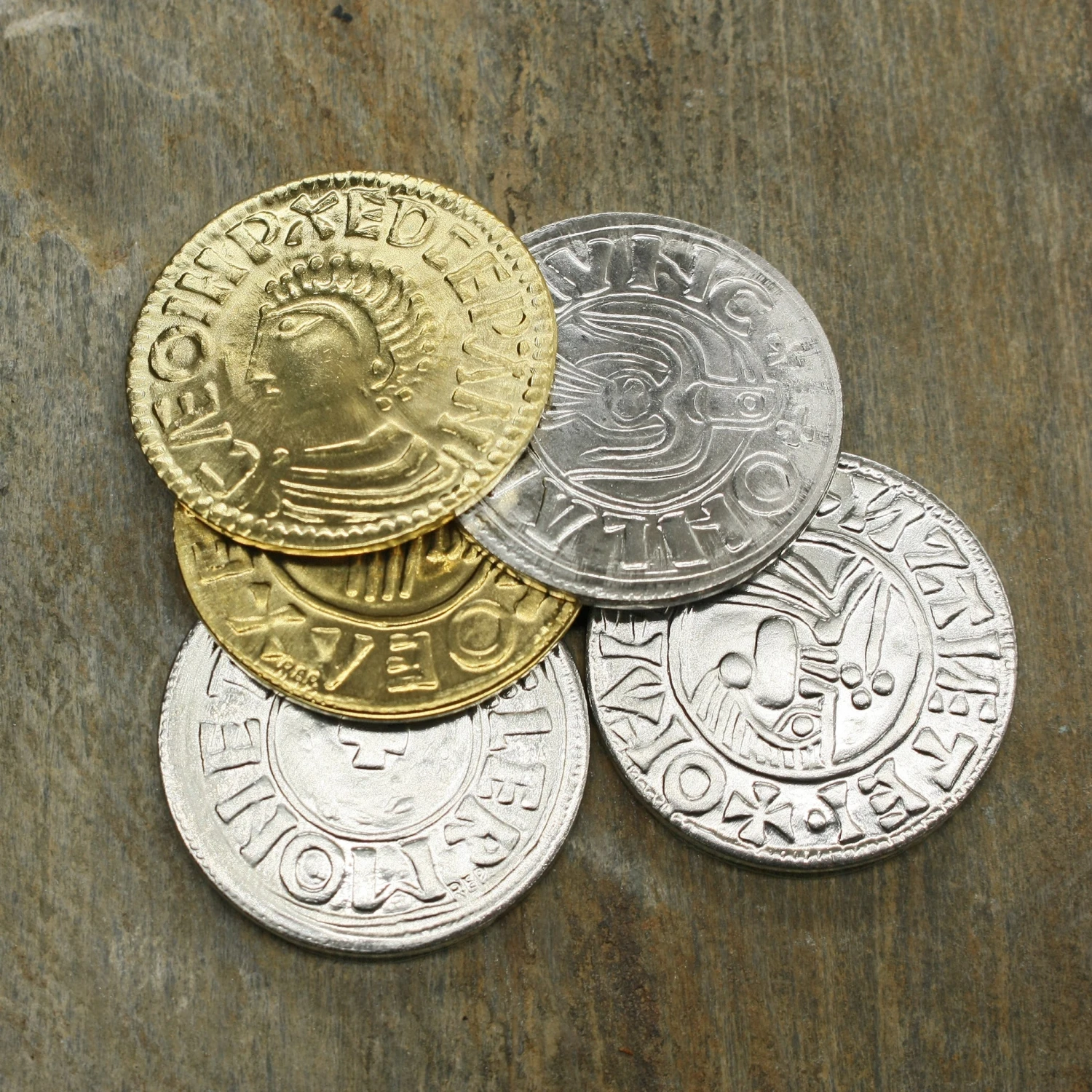 Vikings didn’t use coins as we use them, but used their weight in silver to buy / barter goods and often cut pieces off them to exchange for other goods. The following coins are enlarged replica designs of actual Viking finds and are made in stainless steel & brass.