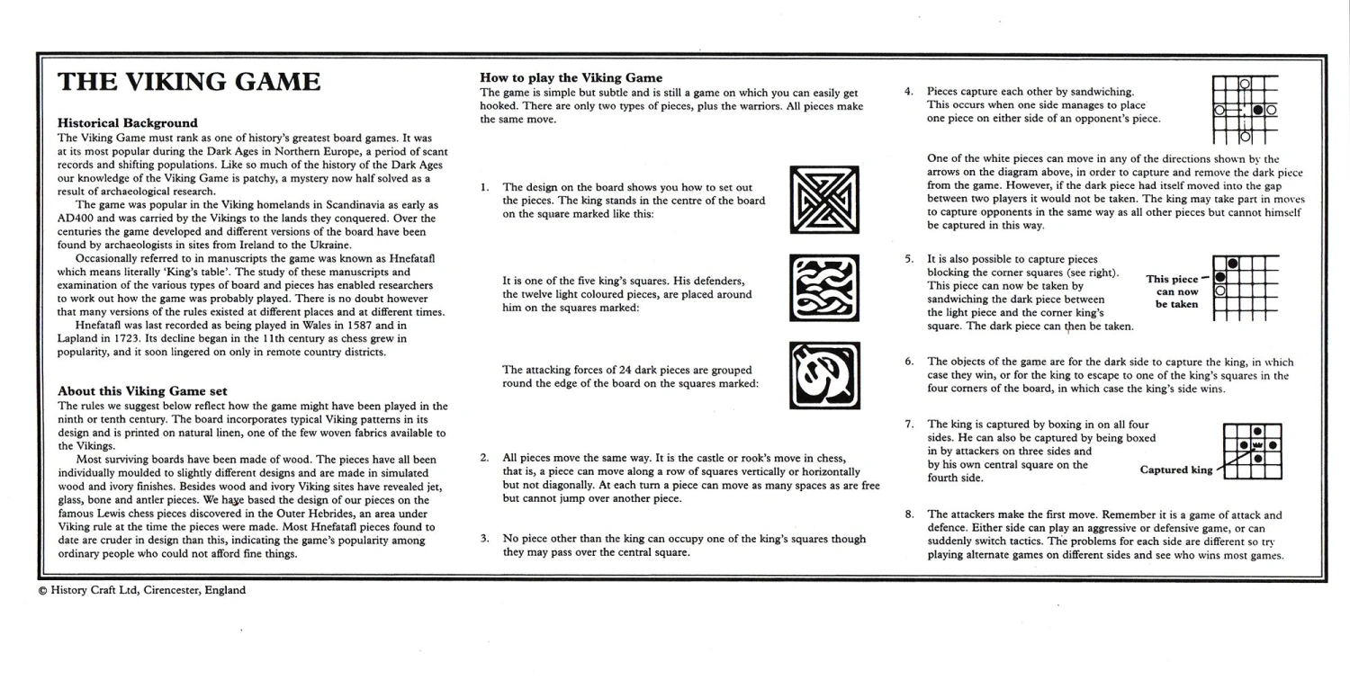 Occasionally referred to in manuscripts, the game was known as ‘Hnefatafl’, which literally means ‘Kings Table’. The study of these manuscripts and examinations of various types of boards and pieces has enabled researchers to work out how the game was most likely played. There is no doubt however that many versions of the rules existed at different places and different times.