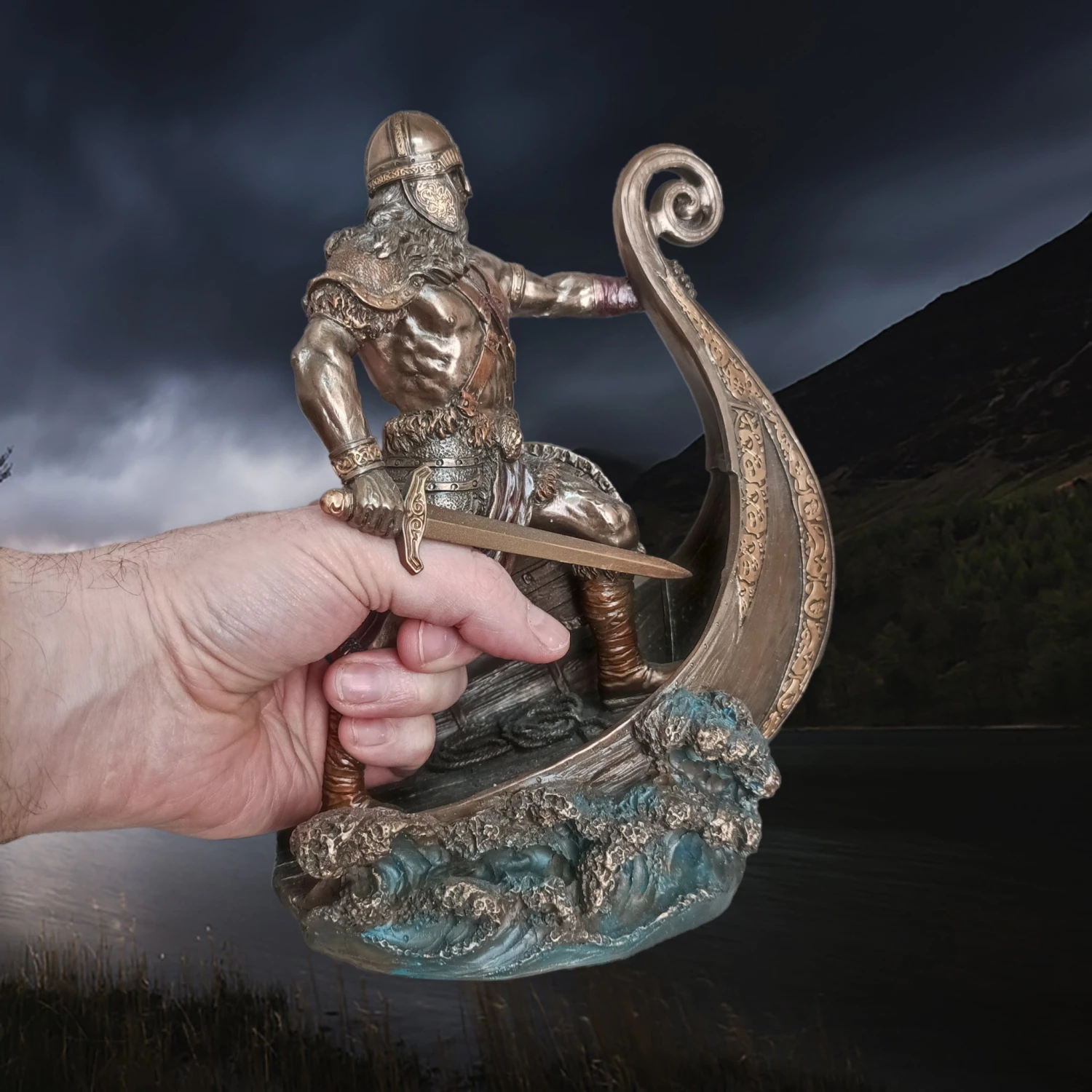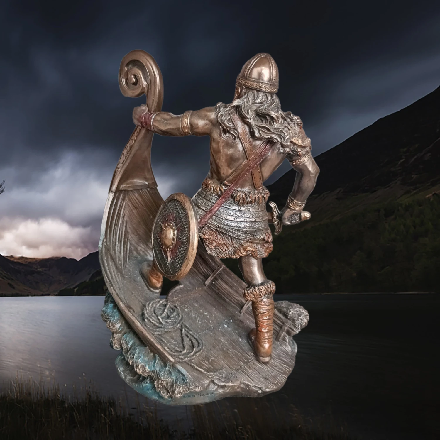 Hand-Painted Large Statue of a Norse Warrior Leader in Solid Resin, with Sword, Shield & Ship.