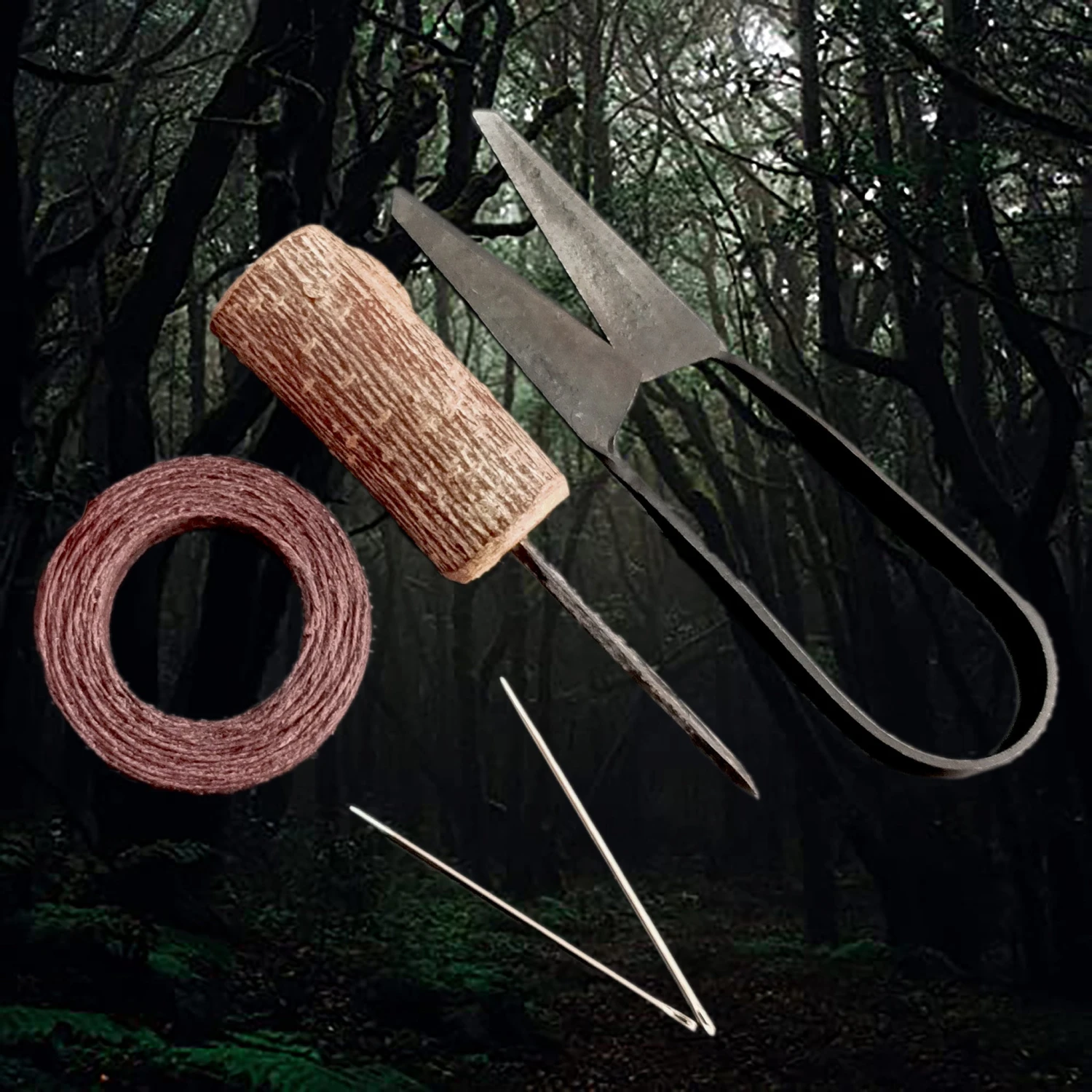 Complete Viking Age Leather Sewing Kit – Birch Wood Handle Awl, Steel Harness Needles & Waxed Linen Thread – With or Without Iron Snips.