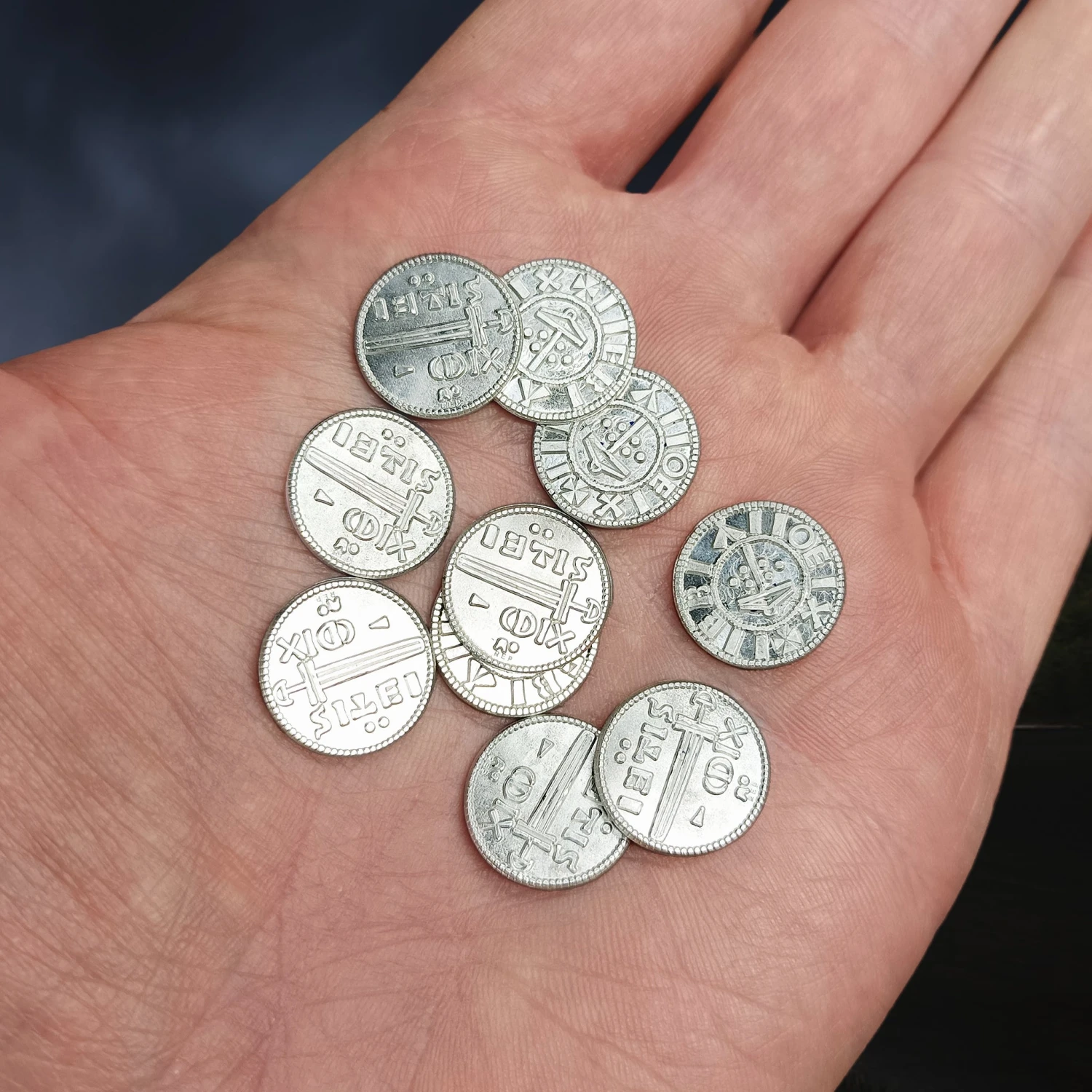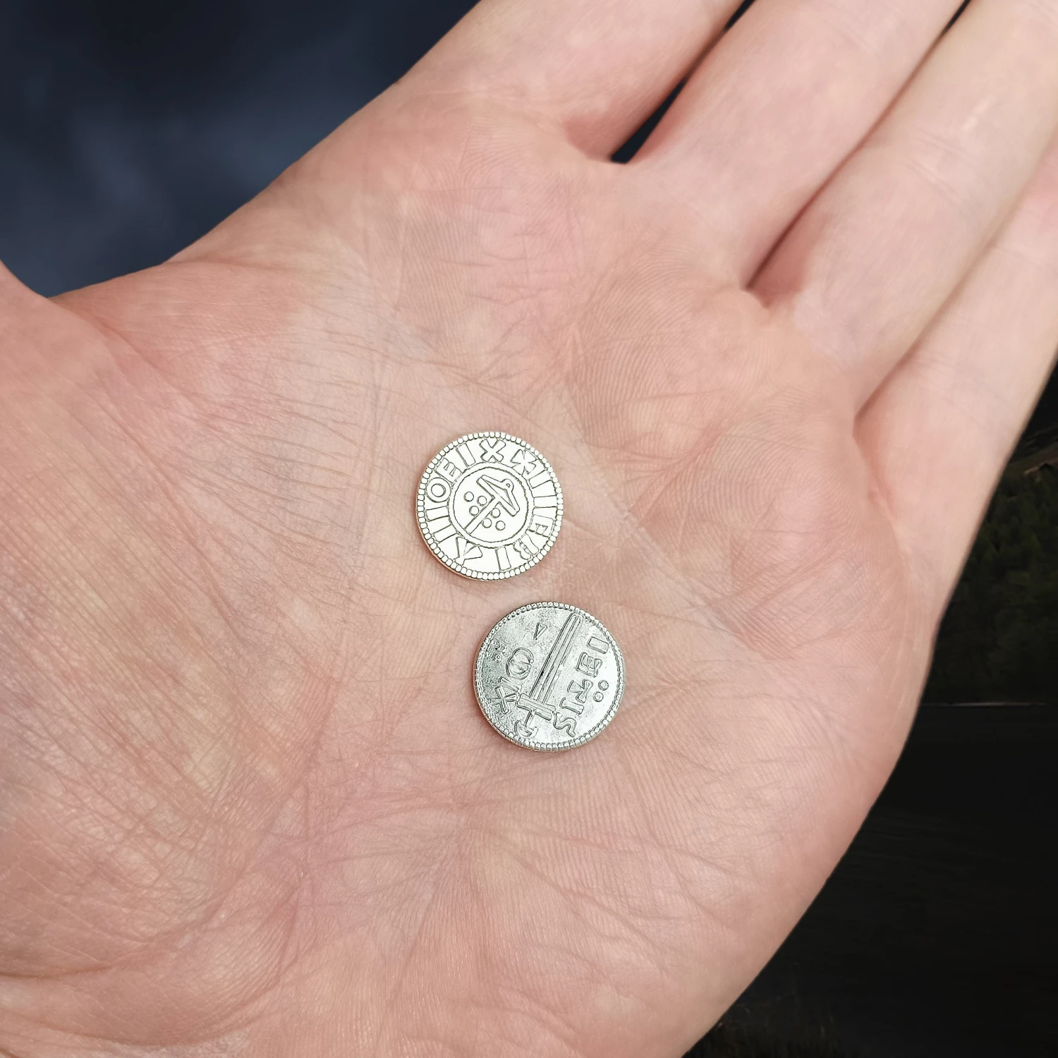 Silver coloured small replica Viking coins depicting a sword one side and Thor’s hammer, Mjolnir on the other side. The runes above and below the sword spell out: ‘SCI PETIIIIO’ (Sancti Petri Moneta – the money of St. Peter) and the Thor’s hammer side spell out: ‘ERIVIITOI ‘ (Eboraci Civitas – City of York). The original coins date to around 921 – 927AD.