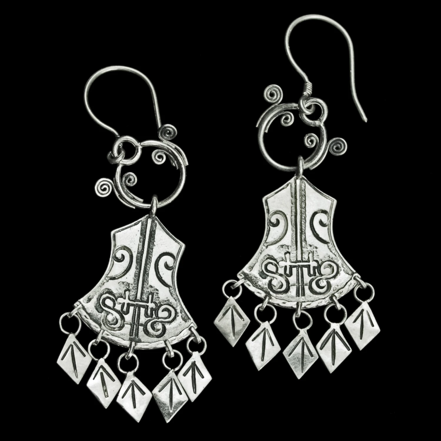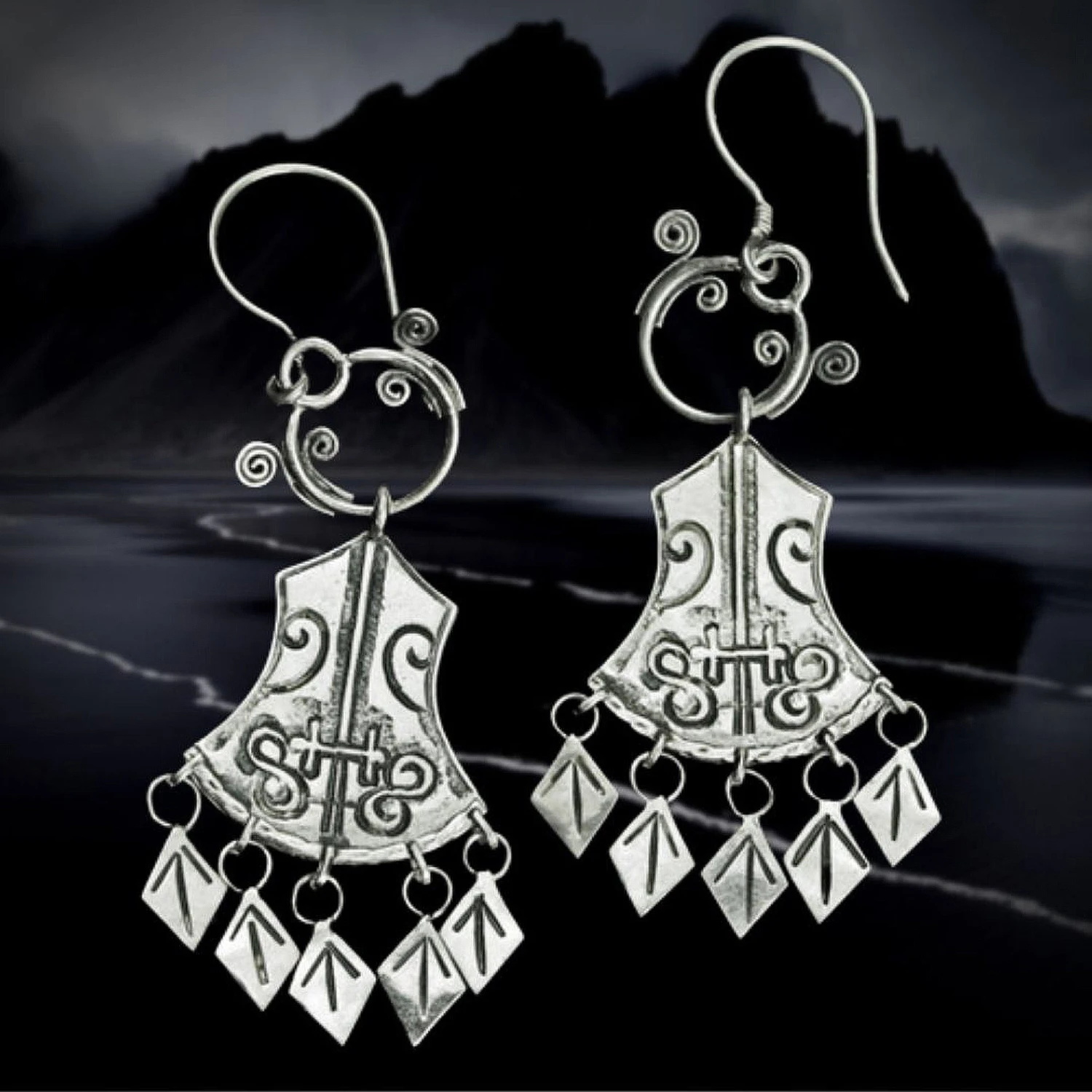 Norwegian Replica Viking Earrings in 925 Sterling Silver with Five Dangling Tiwaz Rune Pendants.