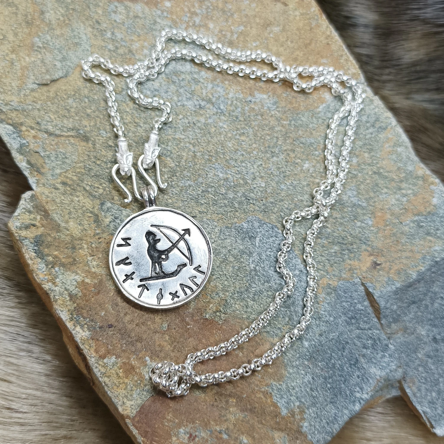 – Skadi Ull inscribed Futhark runes on the front of the pendant with their English names inscribed on the back.