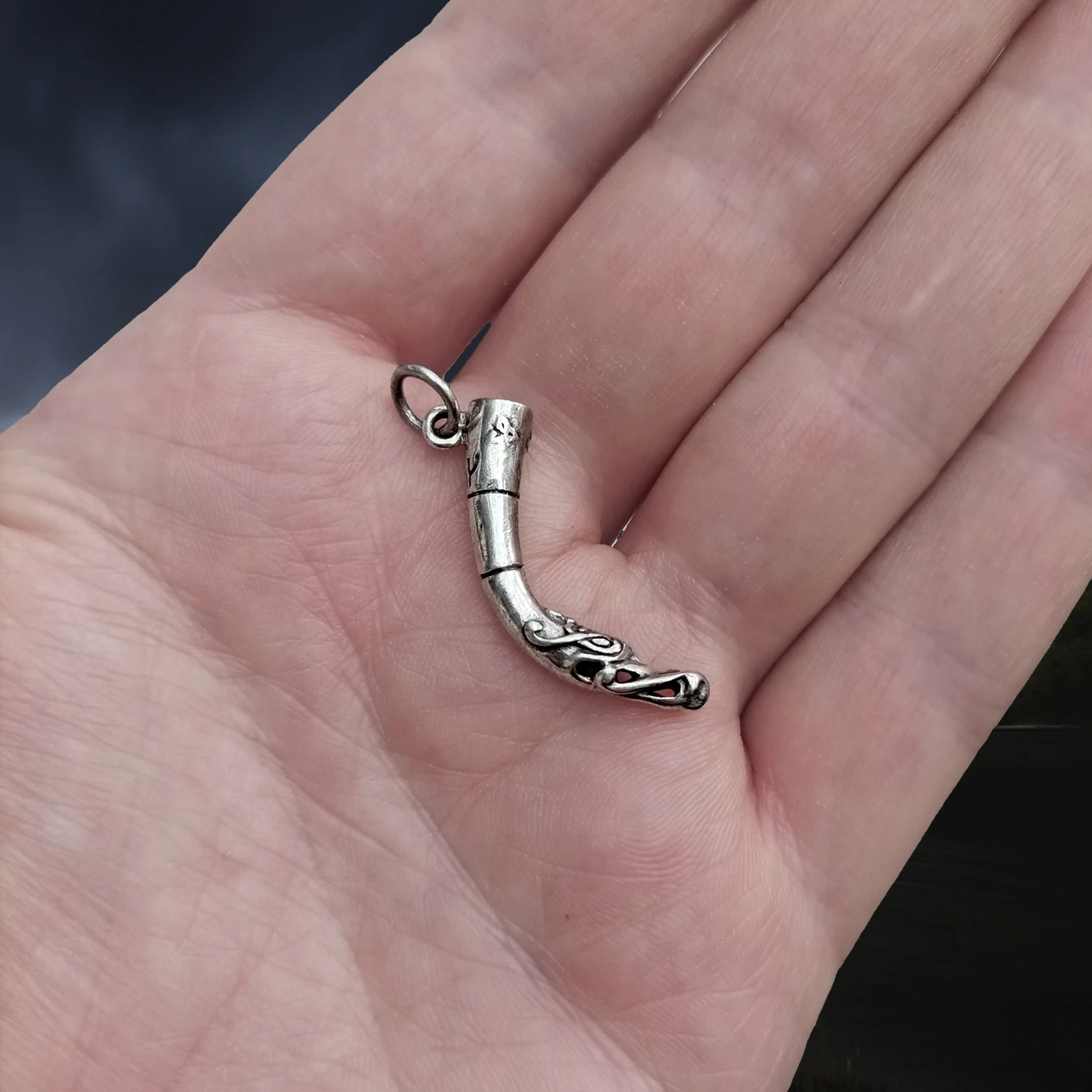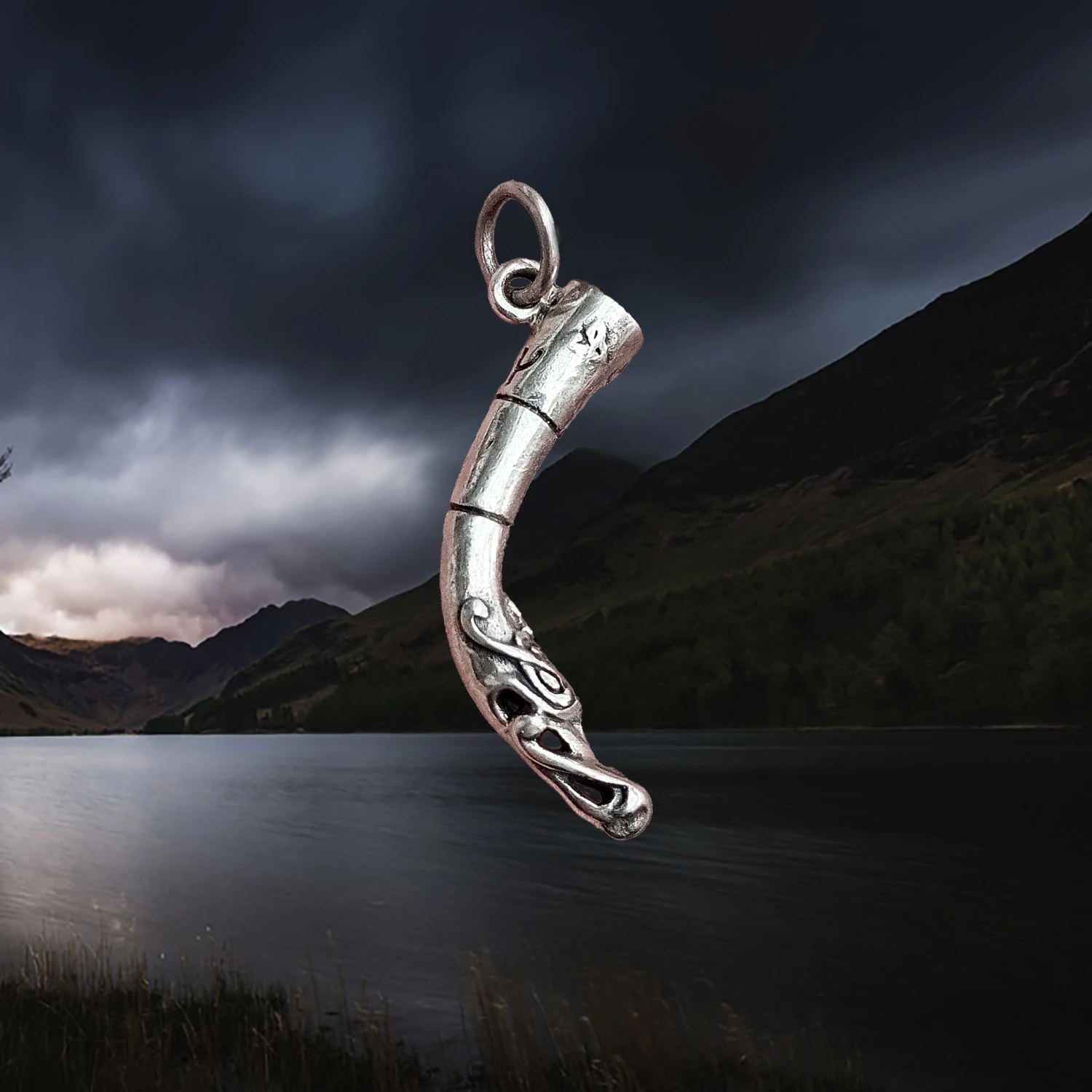 Sterling Silver Viking Drinking Horn Pendant with Norwegian Dragon Head.