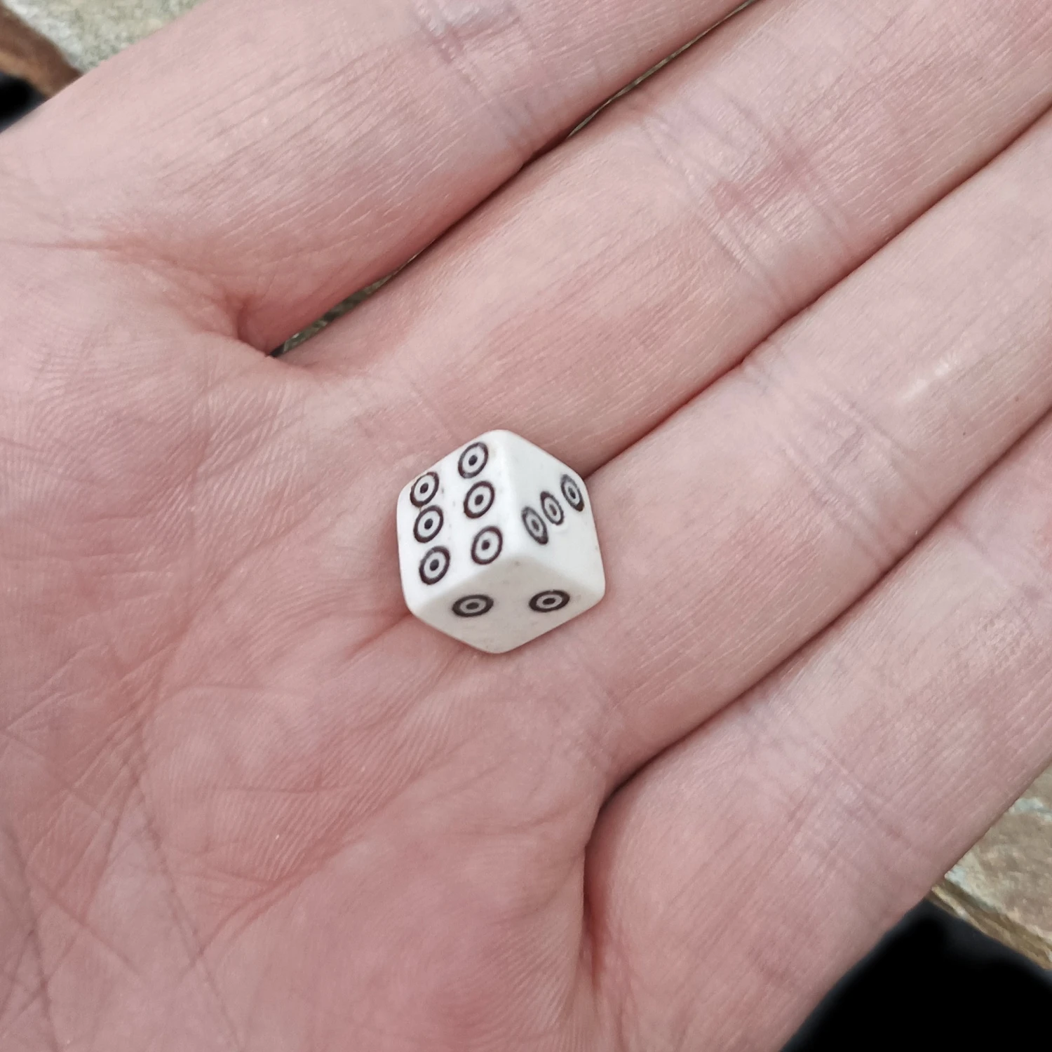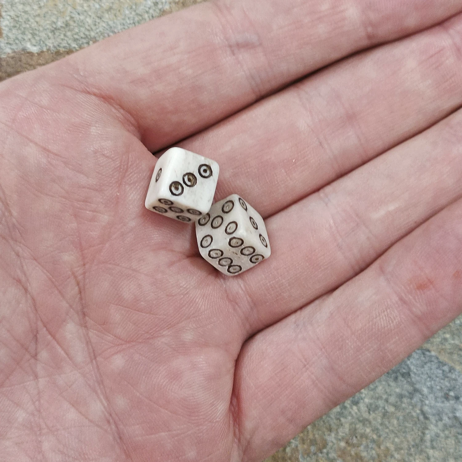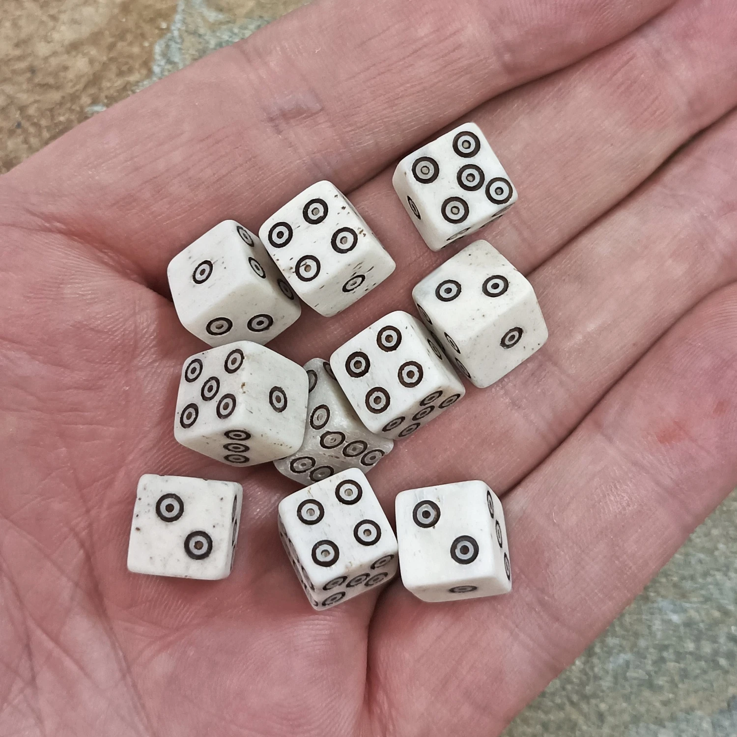 Small Natural Bone Replica Viking Dice with Black Dot and Ring Incised Spots.
