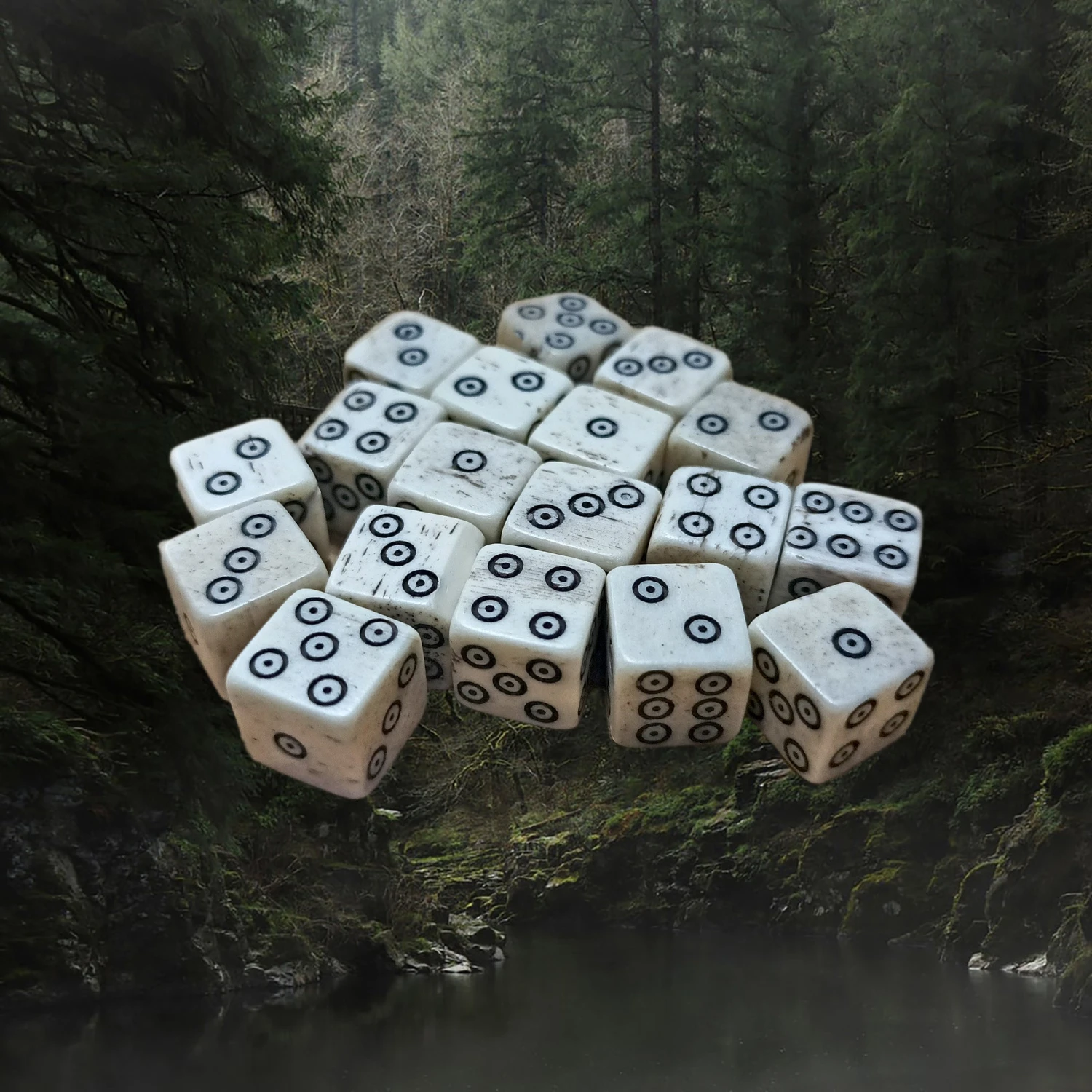 – Natural cow bone dice with black dyed dot and ring markings.Â