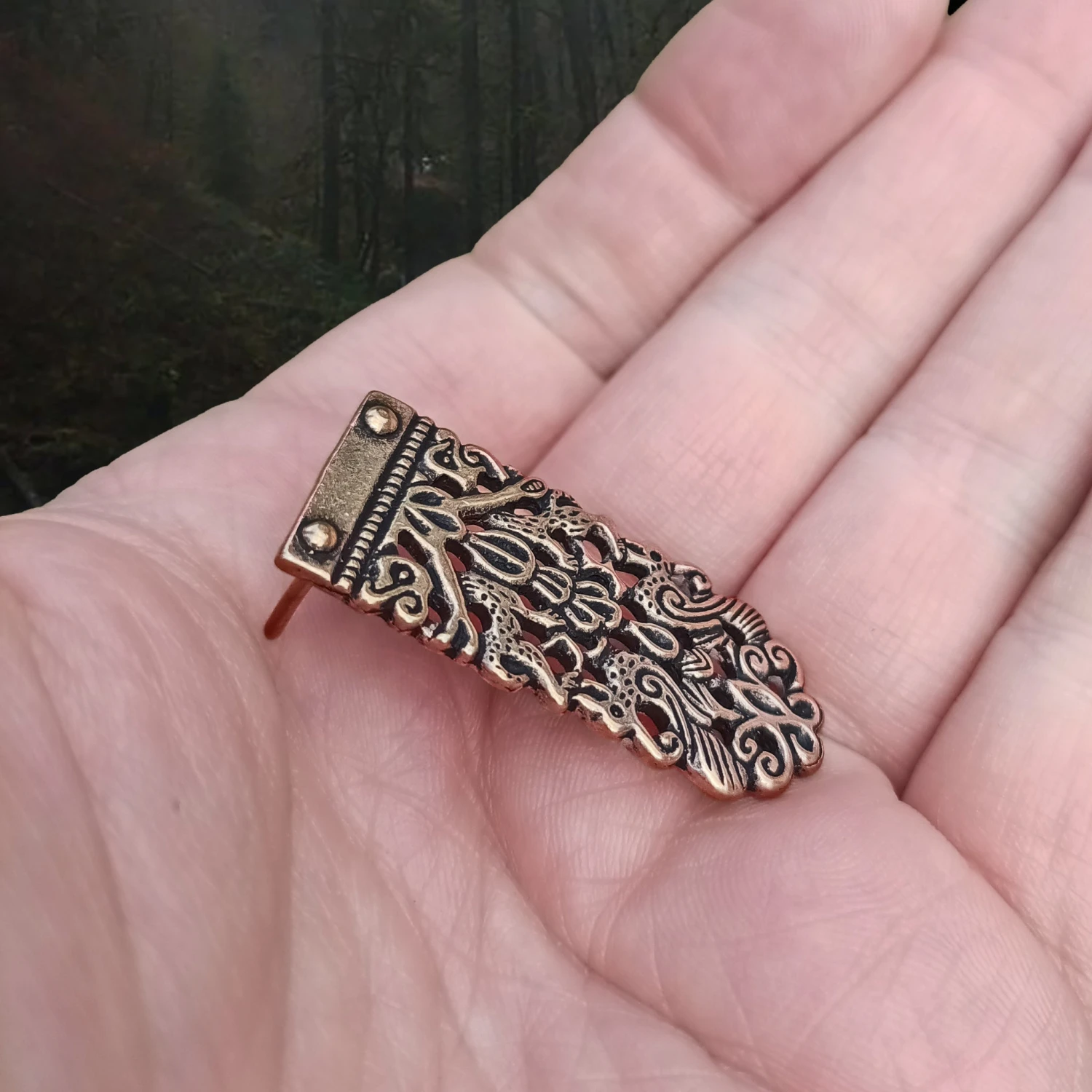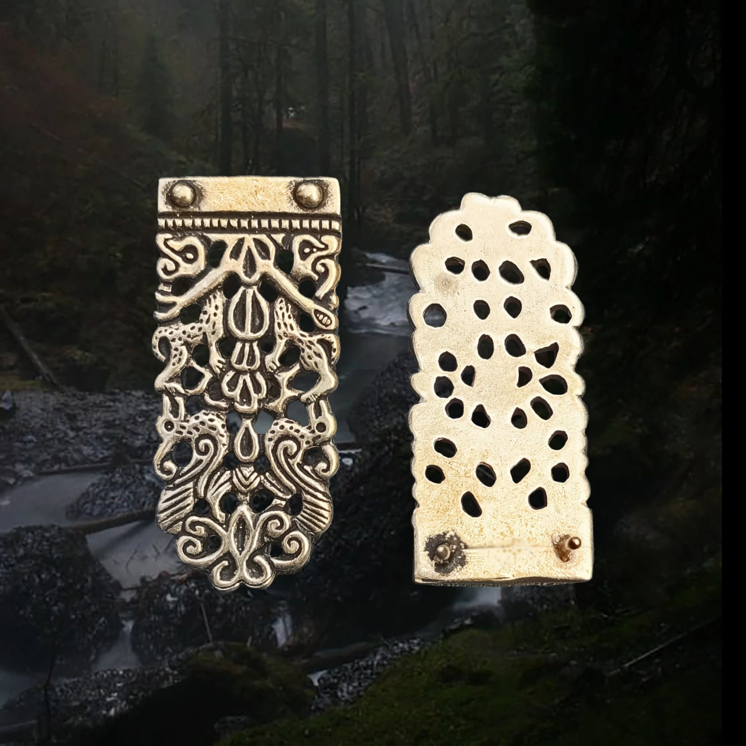 – 2 bronze pins at the back to attach to your strap.