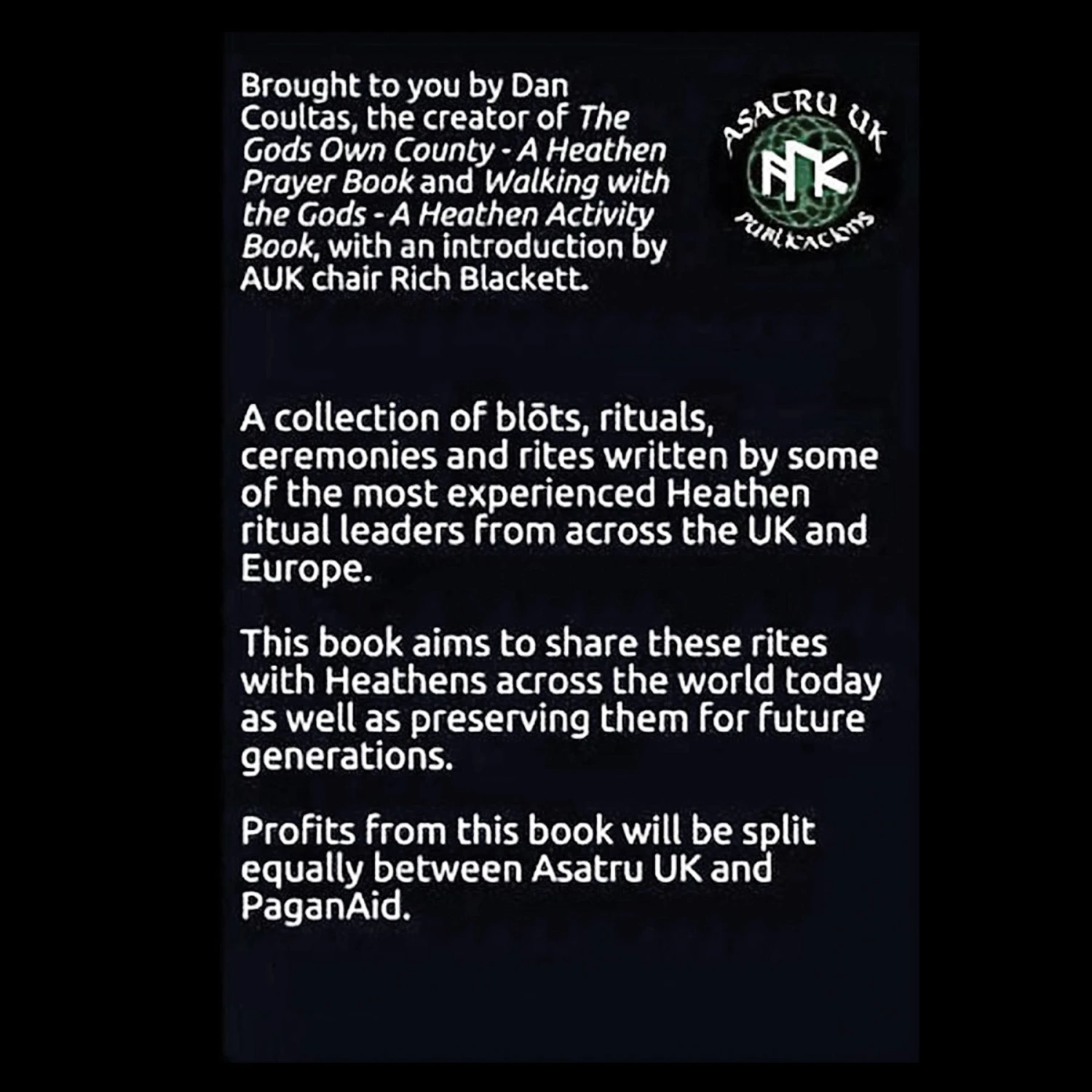 Written by some of the most experienced Heathen ritual leaders from across the UK and Europe. This book aims to share these rites with Heathens across the world today as well as preserving them for future generations. Brought to you by Dan Coultas, the creator of ‘The Gods Own County – A Heathen Prayer book’, with an introduction by AUK chair Rich Blackett. Profits from this book will be split equally between Asatru UK and PaganAid.