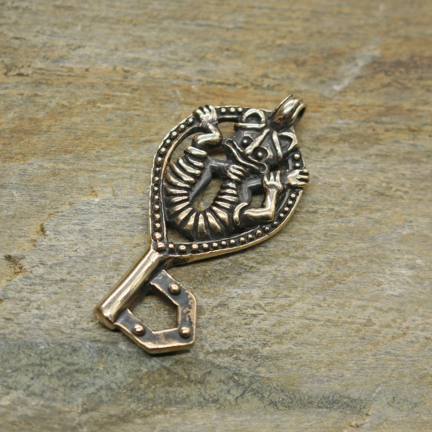 Viking Key Pendant with Suspension Loop and Gripping Bear Design in Silver or Bronze.